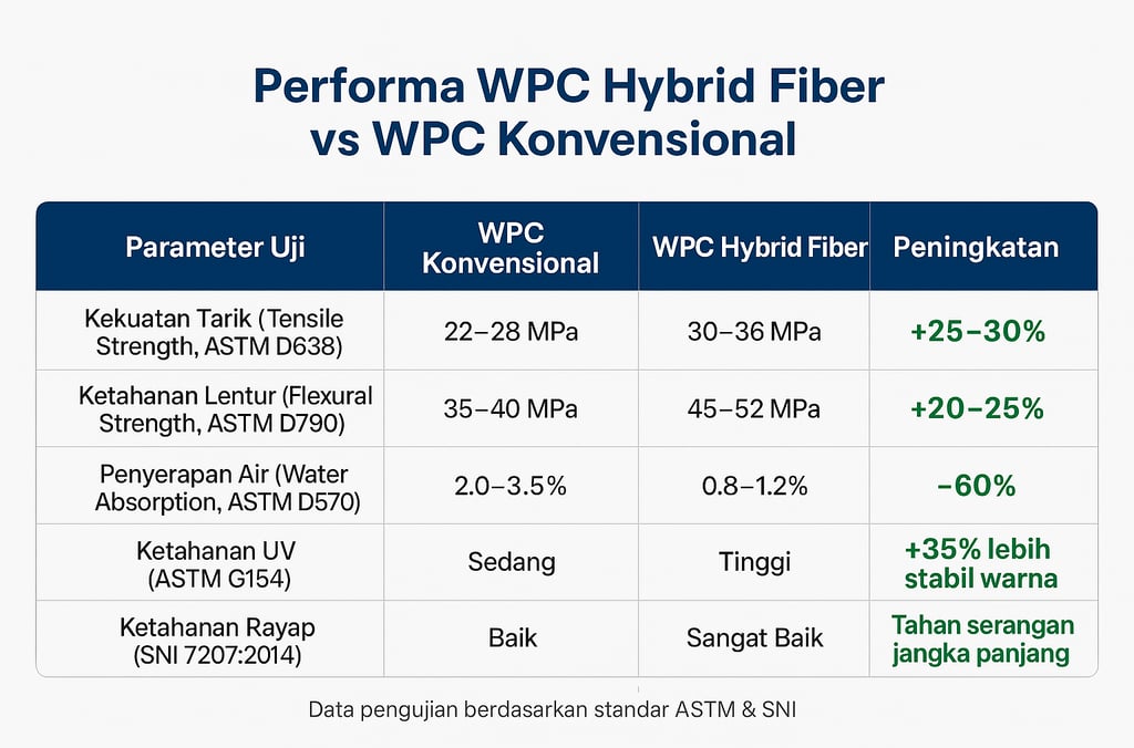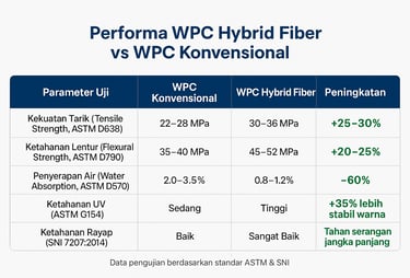 Sumber: ASTM Standard Test Reports, ScienceDirect Hybrid WPC Study 2024, Internal Lab Data Porte 2025.