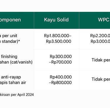 Meskipun harga awal WPC mungkin tampak sedikit lebih tinggi dibanding kayu lunak, setelah memasukkan biaya finishing, pelapisan, dan perawatan awal, WPC justru menjadi lebih kompetitif secara langsung.