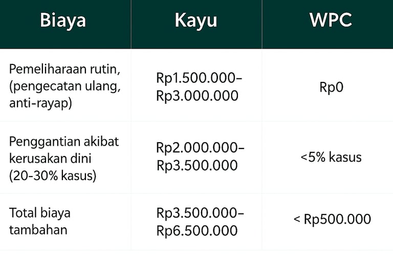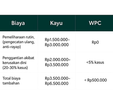 Meski perbandingan biaya awal antara kayu dan WPC relatif seimbang, analisis Total Biaya Kepemilikan menunjukkan bahwa: