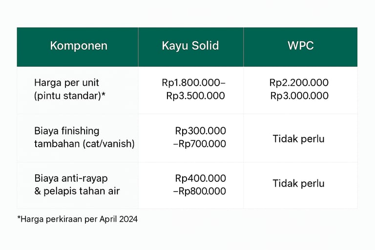 Dalam memilih material pintu untuk proyek konstruksi, penting untuk tidak hanya melihat harga awal, tetapi juga mempertimbangkan total biaya kepemilikan (Total Cost of Ownership). Artikel ini membandingkan WPC (Wood Plastic Composite) dengan kayu dari segi biaya perawatan rutin, risiko penggantian akibat kerusakan dini, dan akumulasi biaya jangka panjang. Hasilnya menunjukkan bahwa WPC menawarkan penghematan signifikan berkat sifatnya yang tahan rayap, anti-lembap, dan minim perawatan—menjadikannya solusi cerdas dan ekonomis bagi arsitek, kontraktor, dan pemilik bangunan.