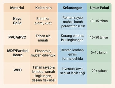 Dengan teknologi finishing baru seperti laminasi hot-press dan textured embossing, WPC kini dapat menyerupai kayu alami secara visual sekaligus menawarkan kemudahan pemeliharaan.